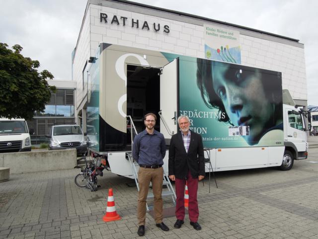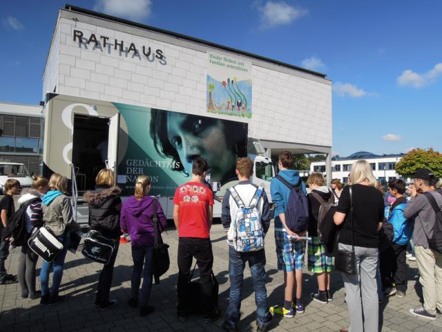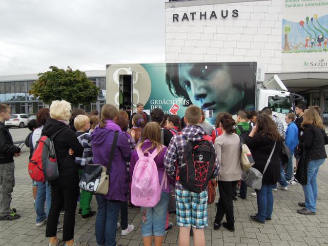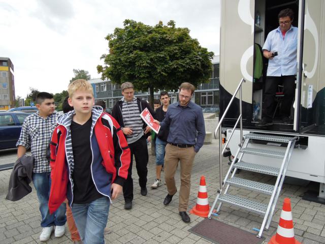Das mobile Aufnahmestudio auf dem Rathausplatz in Salzgitter weckt großes Interesse der Schülerklassen.