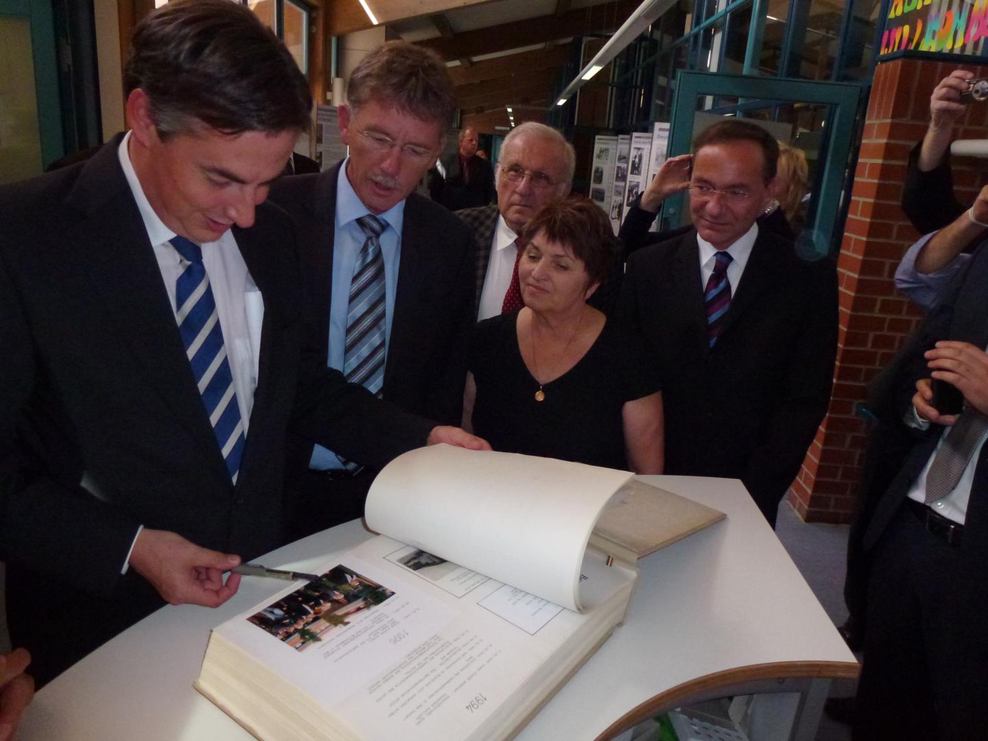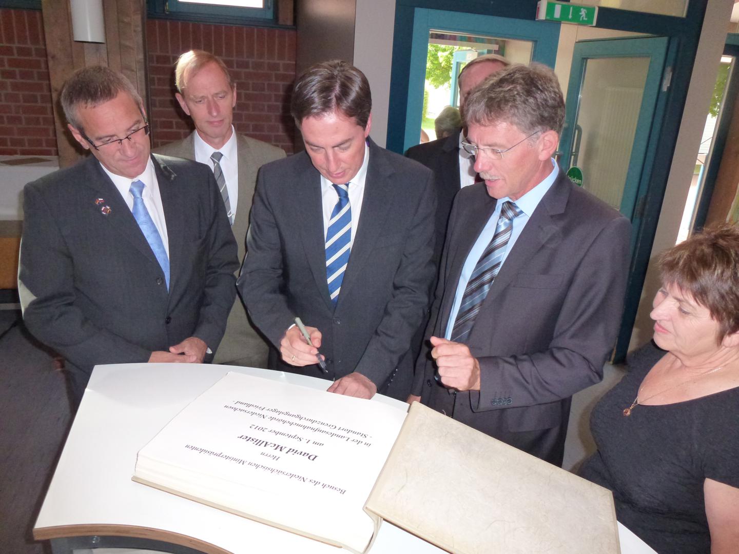 Der Niedersächsische Ministerpräsident David McAllister trägt sich in die Friedlandchronik ein.
