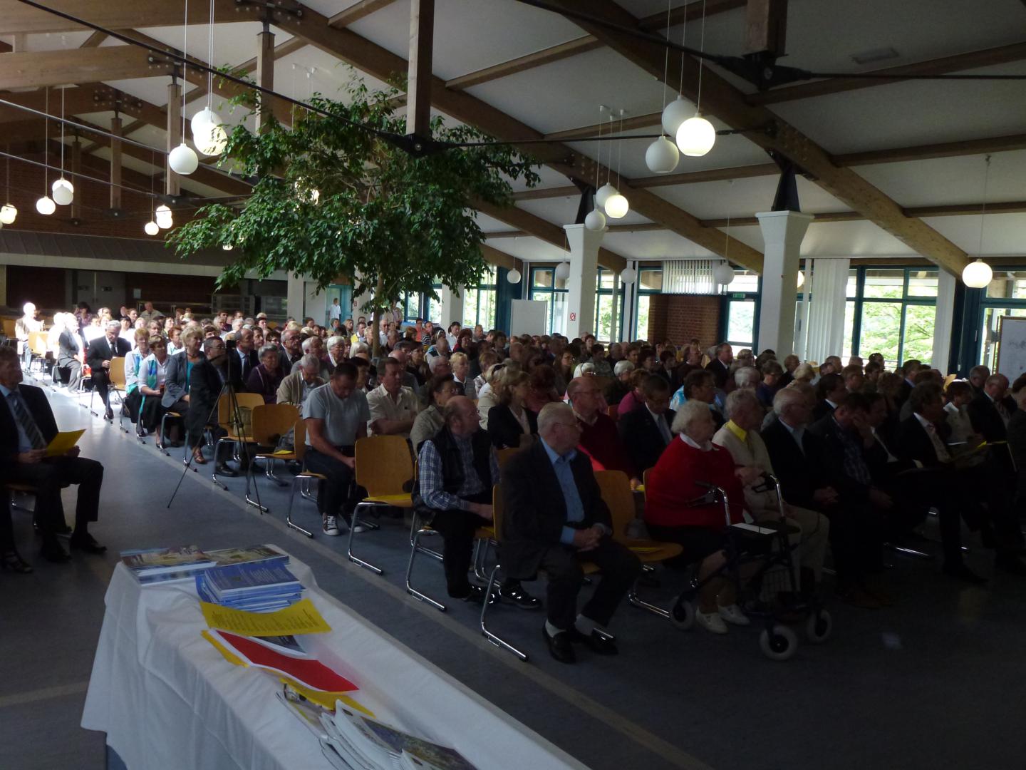 Ein Blick auf die gut besuchte zentrale Gedenkfeier der Landsmannschaft der Deutschen aus Russland am 01. September 2012 im Wirtschafts- und Sozialgebäude im Grenzdurchgangslager Friedland.